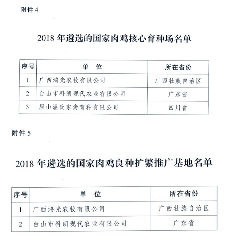 近日,國家農業農村部辦公廳公布了2018年遴選的“國家肉雞核心育種場”和“國家肉雞良種擴繁推廣基地”,臺山科朗順利通過層層考核,被同時批準為“國家肉雞核心育種場”和“國家肉雞良種擴繁推廣基地”。